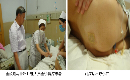 三峽大學(xué)仁和醫(yī)院內(nèi)一科是神經(jīng)內(nèi)科,呼吸內(nèi)科和理化中毒的大科,該院郝巧蓉護(hù)士長(zhǎng)和陳慧敏醫(yī)生熱情地接待了金教授。近期,該科接診了一位淋巴結(jié)核創(chuàng)面的老年患者,該患之前在外科住院兩個(gè)月,考慮到患者的年齡較大,醫(yī)生未對(duì)該患施行手術(shù)。目前該患的創(chuàng)面,未有大量分泌物滲出,竇道已封閉。該院在為該患治療時(shí),曾用過安福消炎膏,龍血竭粉外敷于創(chuàng)面,效果不理想,后改用美寶創(chuàng)瘍貼和濕潤(rùn)燒傷膏換藥已有一個(gè)多月。金教授仔細(xì)查看了該患創(chuàng)面,創(chuàng)面有供血,但無滲液,金教授建議患者的主治醫(yī)生繼續(xù)使用美寶創(chuàng)瘍貼和濕潤(rùn)燒傷膏聯(lián)合換藥,并講解了換藥時(shí)的注意事項(xiàng)。
