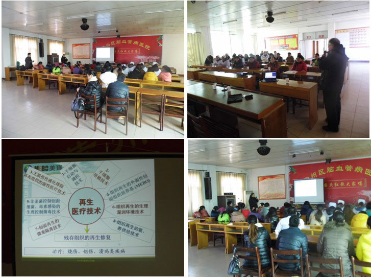 金黨軍教授針對醫(yī)院的情況,重點圍繞慢性皮膚潰瘍的治療技術(shù),從濕性燒傷治療技術(shù)開始講解燒燙傷創(chuàng)面的換藥原則和方法,并提醒大家,燒燙傷創(chuàng)面換藥的方法貫穿所有慢性皮膚潰瘍,如壓瘡、糖尿病足、脈管炎引起的皮膚潰瘍等等常見創(chuàng)面;金黨軍教授還講述了清理創(chuàng)面遵循的三個原則,并結(jié)合實例臨床圖片,詳細講解了美寶再生醫(yī)療技術(shù)的理論和實踐。整個培訓(xùn)班進行了兩個小時,醫(yī)生們都表示收獲很多,對美寶再生醫(yī)療技術(shù)有了初步認識。住院部一樓的付護士長還專門請金老師到科室會診一位褥瘡患者,金老師會診后提出了治療方案,并結(jié)合剛剛課堂上講的方法,給病房護理人員講解再生技術(shù)臨床實踐的注意事項等。
