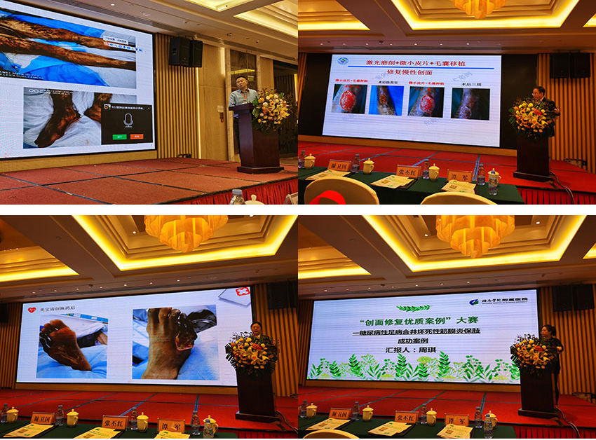 第二屆“榮祥杯”病例大賽一等獎獲得人員分別作了參賽病例的匯報,為各基層醫(yī)護人員規(guī)范使用再生醫(yī)療技術的努力和發(fā)展提供了方向和標桿。婁底市第一人民醫(yī)院周勇以《再生醫(yī)療技術在特重度燙傷100%TBSA 患者中的應用》為主題;瀏陽市人民醫(yī)院焦獻功以《美寶濕潤燒傷膏治療特大面積燒傷創(chuàng)面》為核心;湖南省人民醫(yī)院姚夢枝以《為糖尿病患者保駕護航--多學科診療合作(MDT)》為方向;湘南學院附屬醫(yī)院周琪以《一糖尿病性足病合并壞死性筋膜炎保肢成功案例》、中南大學湘雅三醫(yī)院胡蛟以《一例壓力性損傷合并截癱患者的創(chuàng)面修復案例 》做了現(xiàn)場病例展示。
