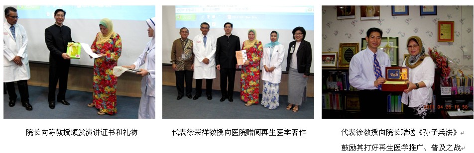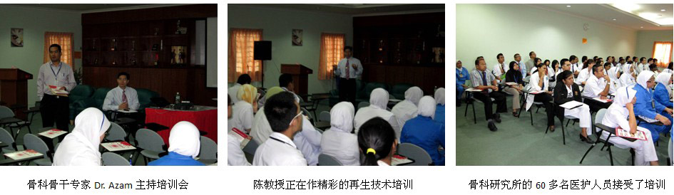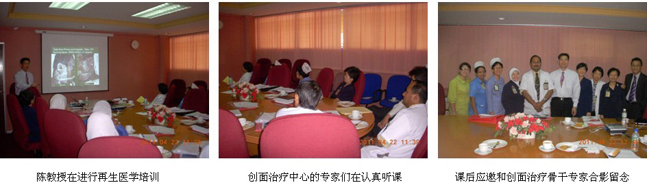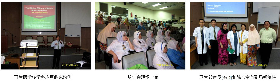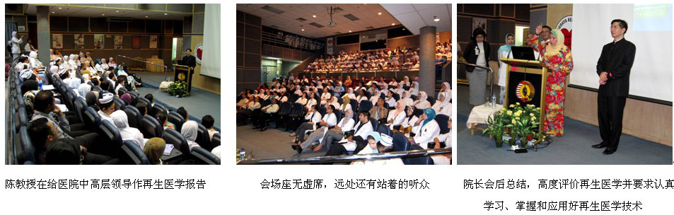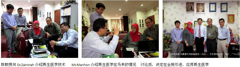 一年后(2011年4月),當(dāng)醫(yī)院院長Dato & Dr. Zaininah獲知陳教授再次來到吉隆坡時(shí),馬上約陳教授到辦公室做客。聽完陳教授對再生醫(yī)學(xué)的介紹后,院長非常激動(dòng),堅(jiān)定馬上組織起全院的各科主任和護(hù)士長,請陳教授進(jìn)行再生醫(yī)學(xué)報(bào)告和進(jìn)行培訓(xùn),同時(shí)還組織召開了專題會議,商討全面引進(jìn)再生醫(yī)學(xué)技術(shù)和展開臨床研究、申請將MEBO盡快進(jìn)入到國家基本用藥范圍的計(jì)劃等。