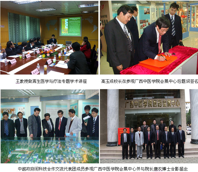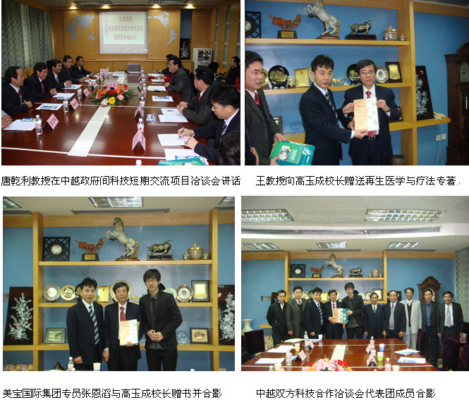 為盡快啟動中越政府間科技交流合作項目,“中越政府間科技合作聯(lián)委會第八次會議短期交流項目暨中越燒傷傳統(tǒng)診療技術(shù)的交流與合作”洽談會于2011年3月22日下午3時在在廣西中醫(yī)學院會展中心7樓第三會議室舉行,出席洽談會的中越雙方代表分別是以廣西中醫(yī)學院院長唐農(nóng)博士,科技處處長、項目負責人唐乾利教授,國際交流與合作處處長蔣基昌副教授、廣西中醫(yī)學院教務(wù)處長辛寧教授、廣西中醫(yī)學院科技處藤建北博士等領(lǐng)導和項目組其他成員組成的中方代表團及以越南順化醫(yī)藥大學校長兼附屬醫(yī)院院長高玉成教授,順化醫(yī)藥大學書記兼副校長陳友當教授,順化醫(yī)藥大學附屬醫(yī)院副院長、副書記阮生松博士,順化醫(yī)藥大學工會主席兼藥理部副主任陳文和博士,順化醫(yī)藥大學傳統(tǒng)醫(yī)學部副主任團文翰教授,順化醫(yī)藥大學微生物部副主任陳停平教授一行6人組成的越方代表團,作為知識產(chǎn)權(quán)單位的代表,中國中西醫(yī)結(jié)合燒傷專業(yè)委員會常委、中國燒傷創(chuàng)瘍雜志副總編輯、北京美寶燒傷創(chuàng)瘍研究所副所長、臨床研究部主任王洪生教授、美寶國際集團技術(shù)推廣專員張恩滔應(yīng)邀出席了洽談會。