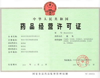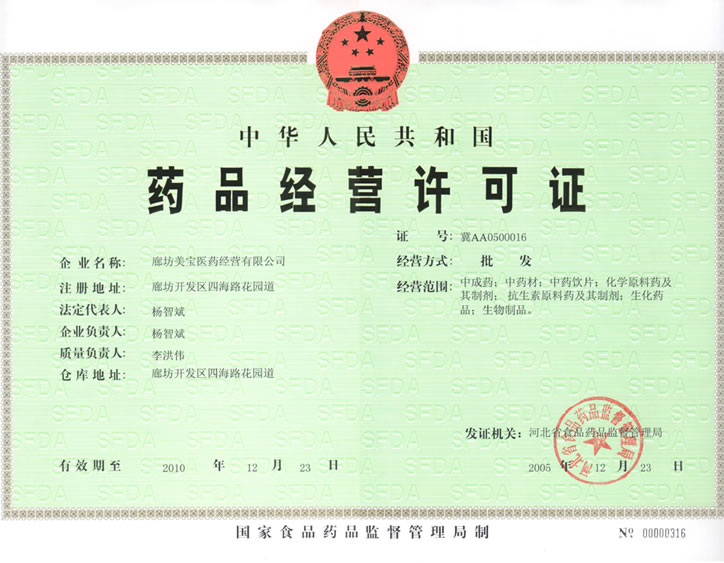 廊坊美寶醫(yī)藥經(jīng)營(yíng)有限公司在基地全體員工的共同努力下,在集團(tuán)董事局的關(guān)懷和指導(dǎo)下,于2005年12月13日順利通過(guò)了藥品監(jiān)督管理局的藥品經(jīng)營(yíng)許可證的驗(yàn)收檢查。并于2005年12月31日取得藥品經(jīng)營(yíng)許可證。這標(biāo)志著廊坊美寶基地按照美寶國(guó)際集國(guó)的總體規(guī)劃,向GSP經(jīng)營(yíng)方向邁出了成功的第一步。