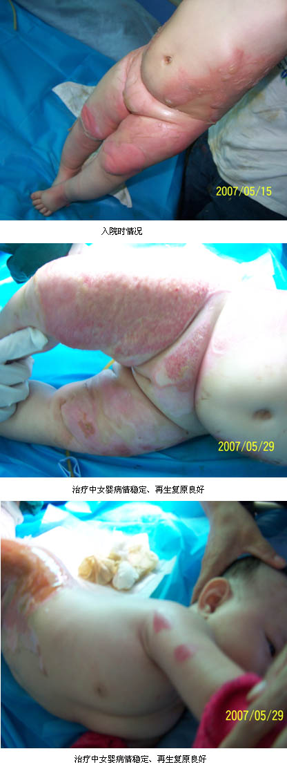 2007年5月16日,一個(gè)只有4個(gè)月大小的女嬰被家長急送到中山市黃圃人民醫(yī)院燒傷創(chuàng)瘍科,原來該患兒在半小時(shí)前被剛燒滾的熱水燙傷了,入院時(shí)檢查,患兒精神萎靡不振,哭聲低,表情淡漠。反應(yīng)差。入院診斷:燒傷休克,大面積特重度熱水燙傷40%TBSA(淺II度5%TBSA,深I(lǐng)I度淺型15%TBSA,深I(lǐng)I度深型10%TBSA,III度淺型5%TBSA,III度深型5%TBSA)。入院后,經(jīng)過積極的抗休克、抗感染等綜合治療,同時(shí)規(guī)范應(yīng)用皮膚原位再生技術(shù)進(jìn)行創(chuàng)面處理,盡管患兒一度出現(xiàn)SIRS表現(xiàn),但由于規(guī)范應(yīng)用皮膚原位再生醫(yī)療技術(shù),患兒平穩(wěn)度過了休克期和創(chuàng)面液化期和高代謝期,經(jīng)過35天的治療患兒創(chuàng)面全部自行愈合。