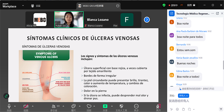 在專題研討環(huán)節(jié),美寶國(guó)際技術(shù)部講師杜鈺涵進(jìn)行了深度學(xué)術(shù)分享,從流行病學(xué)特征、病理生理機(jī)制、國(guó)際診斷標(biāo)準(zhǔn)到再生醫(yī)療技術(shù)的作用機(jī)理與臨床適應(yīng)癥,全方位構(gòu)建了靜脈潰瘍的防治知識(shí)體系。特別針對(duì)聯(lián)合治療方案優(yōu)化、典型病例分析及長(zhǎng)期預(yù)防策略等臨床痛點(diǎn),提供了基于循證醫(yī)學(xué)的解決方案。參會(huì)人員有來(lái)自巴西、秘魯、哥斯達(dá)黎加等不同拉美國(guó)家的醫(yī)生和學(xué)者們多達(dá)130人,大家在會(huì)議期間踴躍提問(wèn),諸如在應(yīng)用再生醫(yī)療技術(shù)期間對(duì)于傷口恢復(fù)的作用、慢性創(chuàng)面的病因與再生醫(yī)療技術(shù)的作用機(jī)制,慢性創(chuàng)面多病因分析與個(gè)體化治療策略等,提出的問(wèn)題得到逐一解答,獲得與會(huì)者一致好評(píng)?,F(xiàn)場(chǎng)互動(dòng)熱烈,充分展現(xiàn)了再生醫(yī)療技術(shù)在慢性創(chuàng)面治療領(lǐng)域的突破性價(jià)值與國(guó)際認(rèn)可度。