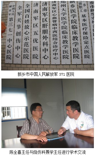 2012年5月10日晚,河南新鄉(xiāng)市中國人民解放軍371醫(yī)院燒傷科主任聶學(xué)邀請北京美寶燒傷創(chuàng)瘍研究所臨床部專家陳全喜主任進(jìn)行學(xué)術(shù)交流,業(yè)務(wù)員楊志強(qiáng)隨行。