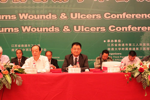 上午九時,代表們齊聚南通大酒店長江殿,開幕式由中國中西醫(yī)結(jié)合學會秘書長穆大偉主持,首先,他向代表們介紹了出息會議的嘉賓:衛(wèi)生部原副部長孫隆椿、南通市副市長楊展里、原衛(wèi)生部科技司司長肖梓仁、中國中西醫(yī)結(jié)合學會燒傷專業(yè)委員會名譽主任委員、人體再生復原醫(yī)療技術創(chuàng)始人徐榮祥、中國醫(yī)師協(xié)會副會長蔡忠軍、國際外科醫(yī)生協(xié)會副主席(阿聯(lián)酋地區(qū)主席),整形美容外科主任阿里教授(Ali AL-Numairy)、美國外科醫(yī)生協(xié)會會員,醫(yī)學博士薩克爾教授(Dr.Mahound Sakr)、中華中醫(yī)藥學會副會長謝陽谷、湖南省醫(yī)保局局長丁春庭、南通市衛(wèi)生局局長、醫(yī)學會會長蔣志群、南通市第三人民醫(yī)院院長、南通市中西醫(yī)結(jié)合學會會長王陸軍、中國中西醫(yī)結(jié)合學會燒傷專業(yè)委員會主任委員肖摩、中國中西醫(yī)結(jié)合學會燒傷專業(yè)委員會顧問趙俊祥、英國皇家外科醫(yī)師學會會員、醫(yī)學博士、腹腔鏡外科醫(yī)生 阿布杜爾哈尼教授(Dr. Maher Mohamed Sayed  Abdulghany)、濟南軍區(qū)衛(wèi)生部副部長梁雨合、南通市衛(wèi)生局副局長胡寧彬、江蘇省中西醫(yī)結(jié)合學會副會長、江蘇省中西醫(yī)結(jié)合醫(yī)院院長王小寧、四川省中西醫(yī)結(jié)合學會秘書長李成林、中國中西醫(yī)結(jié)合學會燒傷專業(yè)委員會副主任委員趙賢忠、中國中西醫(yī)結(jié)合學會燒傷專業(yè)委員會副主任委員賀全勇、中國中西醫(yī)結(jié)合學會燒傷專業(yè)委員會副主任委員付子俊、中國中西醫(yī)結(jié)合學會燒傷專業(yè)委員會副主任委員蘇順清。之后,穆秘書長請孫副部長、楊副市長、肖司長、徐榮祥教授、蔡副會長、謝副會長、蔣局長、王院長等嘉賓致辭。