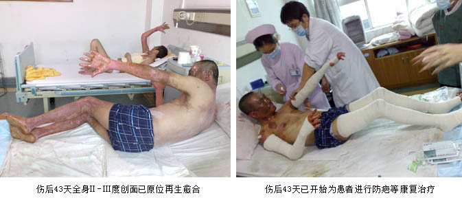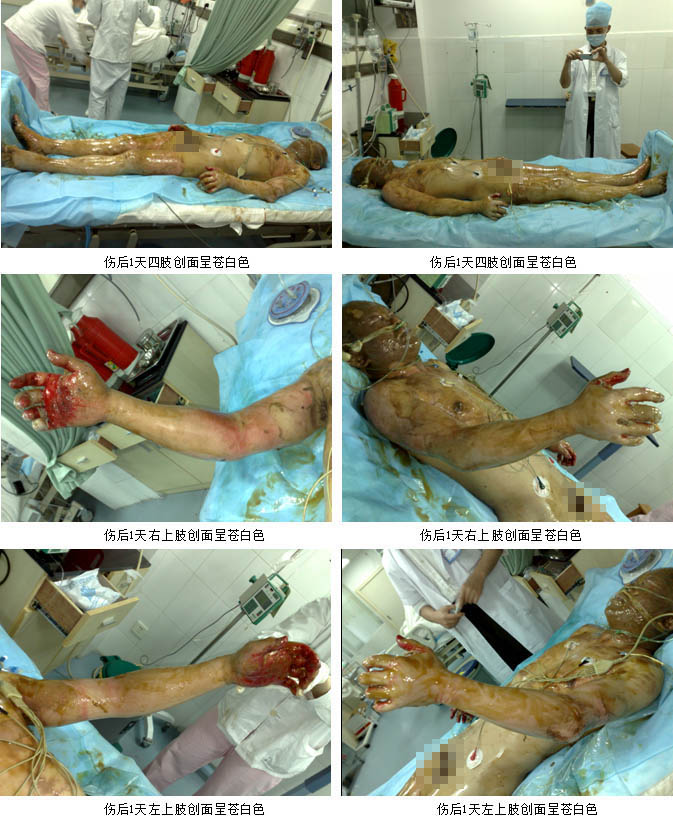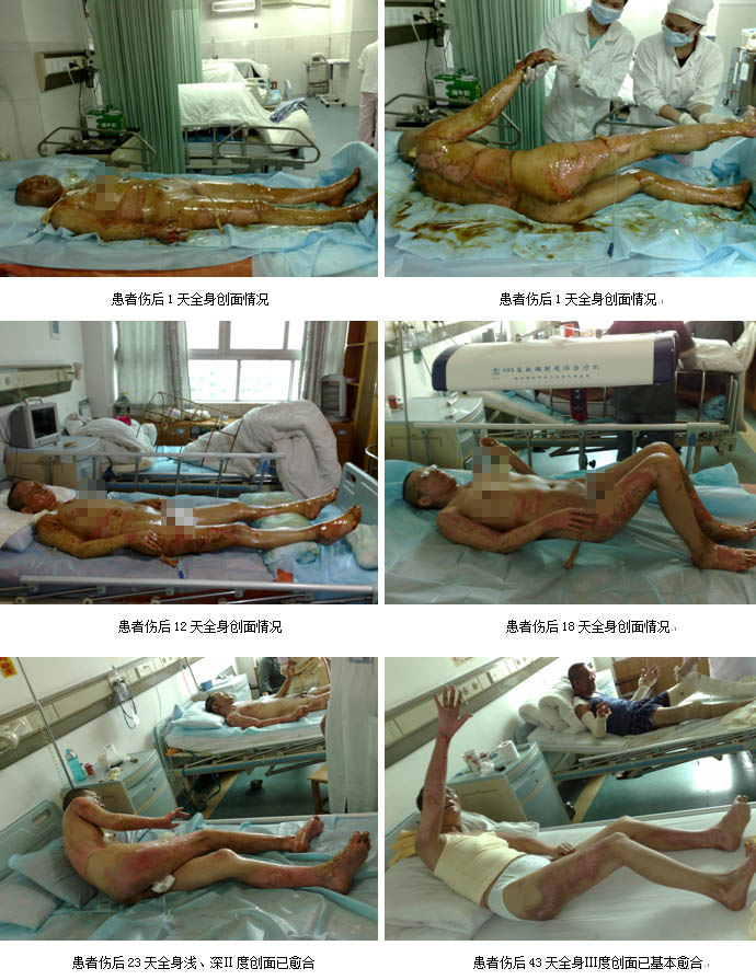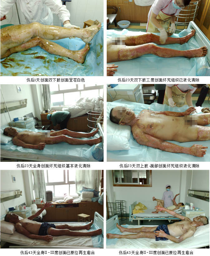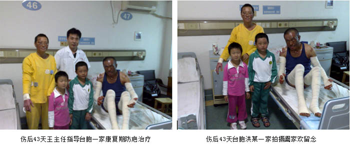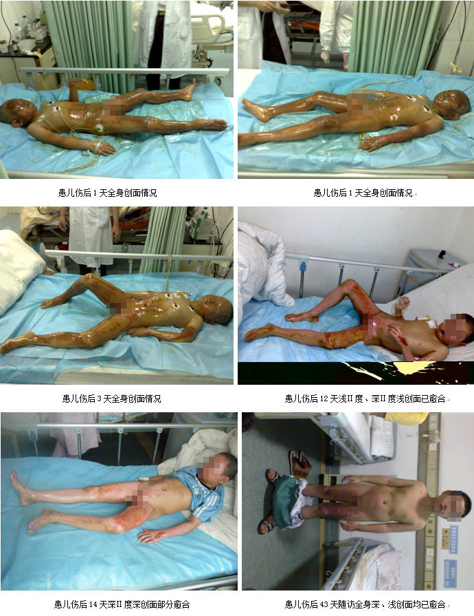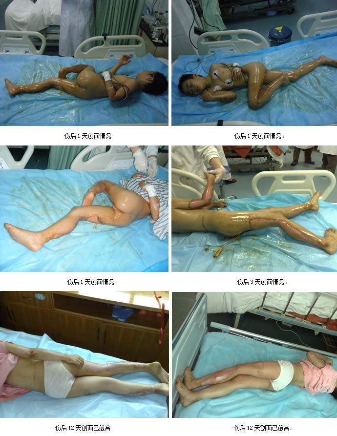 傷后一小時,臺胞洪某一家四口先后被急診轉(zhuǎn)入廣州市中西醫(yī)結(jié)合醫(yī)院ICU病房救治。入院診斷:患者洪某為大面積深度燒傷合并爆震傷生命垂危、兒子為大面積燒傷病情危重、妻子金某為重度燒傷、女兒為中度燒傷。該批患者入住ICU病房后,ICU的醫(yī)護人員立即為每位患者建立了有效的靜脈輸液通道,快速靜滴平衡鹽溶液,進行有效的容量復蘇抗休克等生命支持措施,創(chuàng)面處理采用目前處于國際領(lǐng)先水平的,由我國著名生命科學家徐榮祥教授發(fā)明的燒傷皮膚原位再生復原技術(shù)。為確保對這批臺胞大面積嚴重燒傷患者的成功救治,該院于收治病人的當日上午成立了以主管副院長劉樹華副主任醫(yī)師為組長,大外科主任張向東副主任醫(yī)師為副組長,燒傷外科、ICU等相關(guān)科室專家組成的搶救小組,負責這一家四口臺胞的救治工作。另外為了確保救治的成功,劉樹華副院長立即與中國中西醫(yī)結(jié)合學會燒傷專委會常委、北京燒傷創(chuàng)瘍研究所副所長、臨床部主任王洪生研究員電話聯(lián)系,請求其親臨該院指導該批臺胞的救治工作。在王洪生主任的全程臨床指導下,經(jīng)過廣州市中西醫(yī)結(jié)合醫(yī)院燒傷外科及全院相關(guān)科室醫(yī)護人員夜以繼日的精心治療,臺胞洪某一家四口順利渡過休克、感染關(guān),受傷最重的洪某也闖過ARDS關(guān),轉(zhuǎn)危為安,淺Ⅱ度、深Ⅱ度、淺Ⅲ度創(chuàng)面已原位再生復原(愈合)。目前臺胞洪某一家四口已順利康復,洪某及妻子正在廣州市中西醫(yī)結(jié)合醫(yī)院燒傷外科進行康復期防疤治療,兒子及女兒已正常到學校上課。臺胞洪某和其單位領(lǐng)導都感慨的說,全家因煤氣爆炸燒傷險些家破人亡是不幸的,但全家又受益于燒傷皮膚原位再生復原技術(shù)而轉(zhuǎn)危為安,目前闔家歡樂,真是不幸中的萬幸。