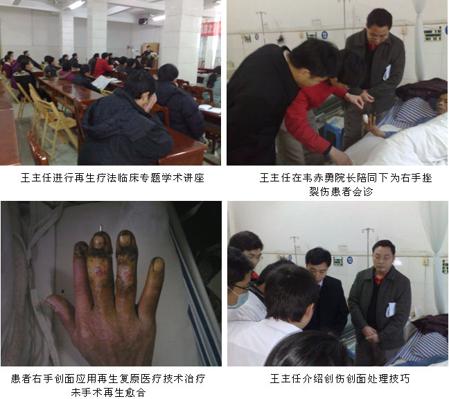 會(huì)后,王主任在該院院長韋赤勇、醫(yī)務(wù)科科長蔡凱及大外科主任、醫(yī)學(xué)專家等陪同下,深入該院創(chuàng)傷外科病房為幾例創(chuàng)瘍患者會(huì)診。韋赤勇院長在同王主任的交流中講到,通過近兩年王主任到該院的多次臨床學(xué)術(shù)交流與指導(dǎo),對該醫(yī)院在治療臨床難愈性創(chuàng)瘍創(chuàng)面和大面積深度燒傷創(chuàng)面上起到了很好的臨床傳幫帶的作用,尤其是該院近期收治的右手挫裂傷及右足貫通傷患者均未行常規(guī)手術(shù)治療而是全程應(yīng)用再生復(fù)原醫(yī)療技術(shù)治療,現(xiàn)該患創(chuàng)面均自行愈合,右手和右足外觀和功能均得到了最大限度地恢復(fù)。韋赤勇院長還表示,再生復(fù)原醫(yī)療技術(shù)有效地幫助了該院醫(yī)務(wù)人員解決了以前很難解決的臨床難題,目前再生醫(yī)療技術(shù)在該院的各科室都進(jìn)行了深入地推廣和應(yīng)用,今年該醫(yī)院要成立燒傷創(chuàng)瘍??疲愿玫脑旄YF港市廣大的創(chuàng)瘍患者。
