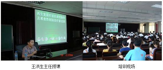 下午三點,由該院外科龍主任致歡迎辭并宣布培訓(xùn)開始,由王洪生主任以“再生復(fù)原療法在深度燒傷及難愈合創(chuàng)面治療新進展”為題做了專題講座,來自該院各科室80余名醫(yī)護人員參加了此次培訓(xùn),王洪生主任在介紹我國著名生命科學(xué)家、醫(yī)學(xué)家徐榮祥教授近年來在人體再生復(fù)原科學(xué)領(lǐng)域取得的重大臨床與實驗研究成果后,從再生醫(yī)學(xué)的理論到該技術(shù)治療燒傷、褥瘡、糖尿病足、各種難愈合創(chuàng)面、疤痕防治及各科室運用的臨床治療規(guī)范做了詳細的講解,參會人員均被再生醫(yī)學(xué)神奇的治療效果所震驚。