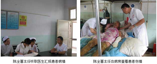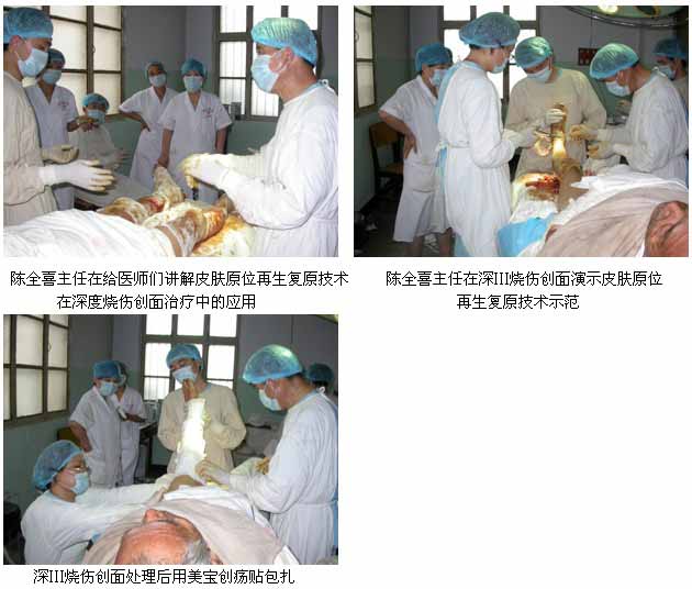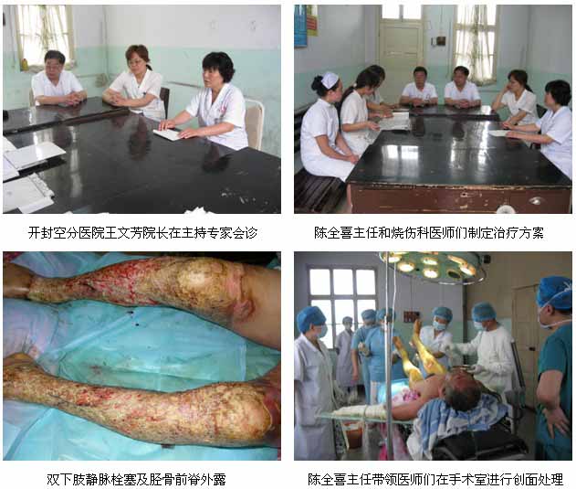 2011年7月2日,北京美寶燒傷創(chuàng)瘍研究所臨床部專家陳全喜主任應(yīng)邀來(lái)到河南開封空分集團(tuán)有限公司醫(yī)院會(huì)診一位嚴(yán)重?zé)齻颊??;颊撸簭埬衬?,男?4歲。入院診斷:雙上肢、雙下肢深Ⅲ度燒傷,燒傷面積44%TBSA。患者入院時(shí)基本情況:面色蒼白,四肢冷,皮膚干燥,脈搏100次/分,呼吸29次/分,血壓80/60mmHg,煩躁。經(jīng)會(huì)診后陳主任指導(dǎo)院方制定了搶救方案。入院立即應(yīng)用皮膚原位再生復(fù)原技術(shù)治療,包括抗休克、保護(hù)心腎功能等系統(tǒng)治療;創(chuàng)面減張,濕潤(rùn)燒傷膏油紗條半暴露治療;保護(hù)肢體血液循環(huán),防止創(chuàng)面損傷加深等措施。待病情穩(wěn)定后于2011年7月4日上午,在王志英副院長(zhǎng)、鄭玉紅主任和陳全喜主任一起為患者進(jìn)行了減張耕耘術(shù)治療,術(shù)后應(yīng)用再生醫(yī)用復(fù)合敷料-美寶創(chuàng)瘍貼對(duì)患者的創(chuàng)面進(jìn)行了包扎,并根據(jù)病情及時(shí)換藥。目前患者病情穩(wěn)定,正在進(jìn)一步的治療中。