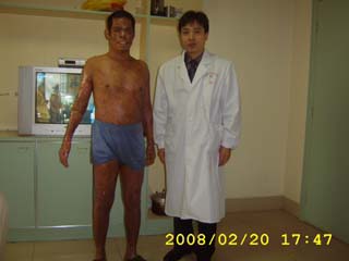 患者入院后,該醫(yī)院院長劉洪光、副院長余天智等院領(lǐng)導(dǎo)多次深入病房協(xié)調(diào)病人的救治工作,并在患者廠方交不上醫(yī)療費(fèi)用的情況下,批示醫(yī)院先墊資全力搶救病人,并組織成立以燒傷外科主任李碧錦為首的搶救小組。為確保對該患者的成功救治,該院于患者入院后即電話請求中國中西醫(yī)結(jié)合學(xué)會燒傷專委會常委、北京美寶燒傷創(chuàng)瘍研究所副所長、醫(yī)療部王洪生主任會診,在王主任全程臨床指導(dǎo)下,李碧錦主任帶領(lǐng)全科醫(yī)護(hù)人員夜以繼日的精心為患者治療:創(chuàng)面處理全程采用燒傷皮膚原位再生醫(yī)療技術(shù),結(jié)合抗休克、抗感染、營養(yǎng)支持及臟器功能保護(hù)等全身綜合治療,傷后二周,創(chuàng)面壞死組織大部分被清除,出現(xiàn)大量新生肉芽組織,部分皮膚有新皮島生長,傷后四周,深I(lǐng)I度深型創(chuàng)面基本愈合,傷后五周,III度燒傷創(chuàng)面也開始有大量皮島生長,創(chuàng)面面積逐漸縮小,第七周后III創(chuàng)面基本愈合。目前,患者已進(jìn)入康復(fù)期,已開始用美寶疤痕平及彈力繃帶加壓包扎對其進(jìn)行康復(fù)期防疤治療。