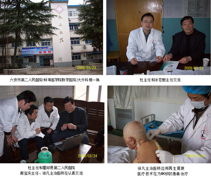 原位再生復(fù)原技術(shù)2009年在安徽革命老區(qū)深入推廣,中國中西醫(yī)結(jié)合學(xué)會燒傷專業(yè)委員會常委、北京燒傷創(chuàng)瘍研究所臨床部研究員、燒傷創(chuàng)瘍專家杜福勤主任應(yīng)邀走訪了安徽省六安市第二人民醫(yī)院(蚌埠醫(yī)學(xué)院教學(xué)醫(yī)院)外科、霍邱縣第二人民醫(yī)院外科。杜主任利用多媒體資料與六安市二院外科涂蒼慨主任、霍邱縣第二人民醫(yī)院外科謝寶慶主任、朱永主任、徐凡主治醫(yī)師進行了“再生復(fù)原醫(yī)療技術(shù)在創(chuàng)瘍創(chuàng)面中療效”和“再生復(fù)原醫(yī)療技術(shù)理論與實踐—創(chuàng)傷與創(chuàng)傷愈合”的交流,交流中涂主任、謝主任、徐大夫?qū)υ偕鷱?fù)原醫(yī)療技術(shù)的神奇療效予以充分肯定,并各自談了自己的臨床實踐和體會。對再生復(fù)原醫(yī)療技術(shù)新產(chǎn)品速愈貼引起極大興趣,并提出臨床開發(fā)建議,希望速愈貼盡快能早日納入醫(yī)保和新農(nóng)合醫(yī)保目錄。造福廣大創(chuàng)瘍患者。
