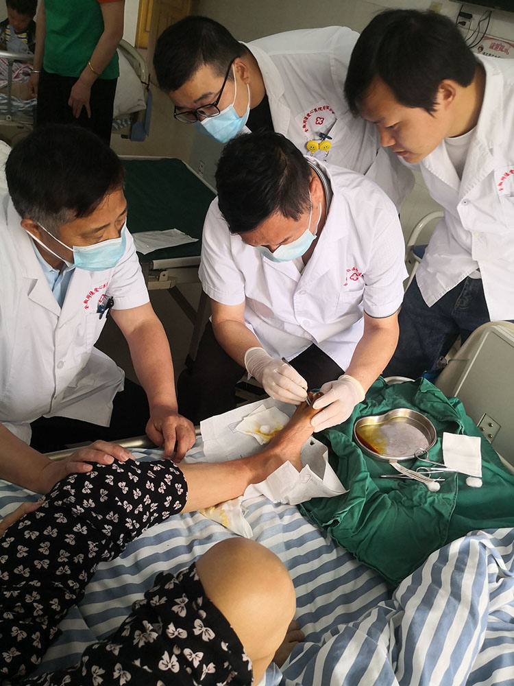 2023年5月19日,中國(guó)中西醫(yī)結(jié)合學(xué)會(huì)燒傷專業(yè)委員會(huì)醫(yī)療部張主任應(yīng)邀前往全椒縣同德愛心醫(yī)院,會(huì)診一例糖尿病足患者和一例褥瘡患者,張主任親自對(duì)創(chuàng)面進(jìn)行清創(chuàng),講解應(yīng)用再生醫(yī)療技術(shù)處理創(chuàng)面及換藥方法。會(huì)診結(jié)束后和醫(yī)生進(jìn)行了病情分析及治療方案的制定。