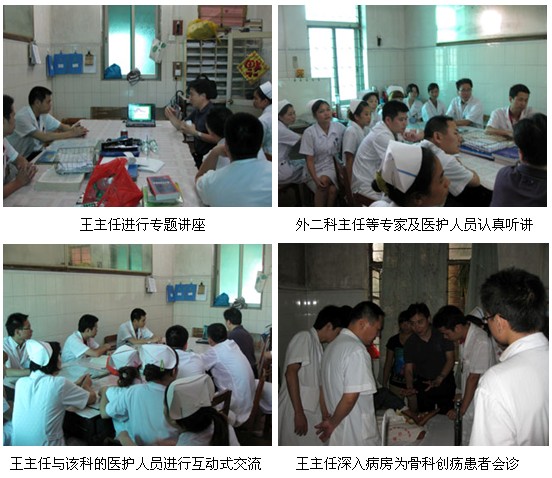 在學(xué)術(shù)講座中,王主任對燒傷的深度劃分結(jié)合臨床圖片做了生動的講解,對各種難愈性創(chuàng)傷,潰瘍創(chuàng)面的規(guī)范處理方法與技巧做了詳細(xì)地講解。學(xué)術(shù)講座結(jié)束后,王主任還應(yīng)邀深入外二科病房,為在骨科住院的骨科創(chuàng)瘍、褥瘡及燒傷會診。