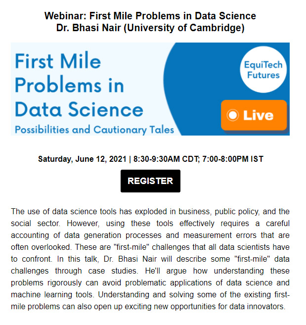 此前,芝加哥大學徐鵬智庫聯(lián)合牛津大學、劍橋大學、加州理工、阿斯本研究所等展開以“技術(shù)賦能未來”為核心的EquiTech Futures項目。為進一步利用科學技術(shù)解決復雜社會挑戰(zhàn),依托該項目,這些有抱負的創(chuàng)新組織徐鵬智庫及劍橋大學再度聯(lián)合召開了此次研討會。本次研討會上,劍橋大學Bhasi Nair博士通過案例研究對這些“第一英里”的數(shù)據(jù)挑戰(zhàn)進行了描述,并論證如何嚴謹?shù)乩斫膺@些問題才可以避免數(shù)據(jù)科學和機器學習工具的各種應用問題。