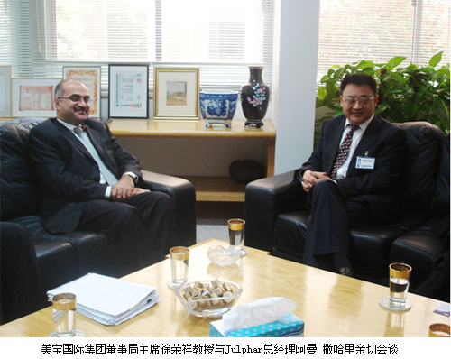 2008年11月8日, 應阿聯(lián)酋Julphar藥廠(Gulf Pharmaceuticals Industries; www.julphar.com) 現(xiàn)任總經(jīng)理阿曼 撒哈里 (Ayman Sahli) 的盛情邀請, 美寶國際集團董事局主席徐榮祥教授率領美寶高層團隊對Julphar藥廠進行了為期3天的正式友好訪問.