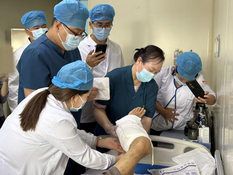 下午,訪問團(tuán)的成員們分批進(jìn)入手術(shù)室,參觀并參與清創(chuàng)、微粒皮種植等手術(shù),每一個(gè)操作細(xì)節(jié)的展示都幫助他們將理論知識(shí)與實(shí)際操作深度結(jié)合,有效提升了其對(duì)再生醫(yī)療技術(shù)相關(guān)手術(shù)操作規(guī)范的理解與掌握程度,為今后在本國開展同類手術(shù)積累了關(guān)鍵的實(shí)踐經(jīng)驗(yàn)。觀摩活動(dòng)結(jié)束之后,燒傷整形與創(chuàng)面修復(fù)科的醫(yī)生們繼續(xù)帶來了燒傷再生醫(yī)療技術(shù)治療壞死性筋膜炎、燒傷再生醫(yī)療技術(shù)救治糖尿病足臨床實(shí)踐效果的經(jīng)驗(yàn)分享,并在分享結(jié)束后與蒙古國的醫(yī)護(hù)就兩國在再生醫(yī)療技術(shù)上的差異和不同經(jīng)驗(yàn)展開了深入交流。通過對(duì)比兩國在患者體質(zhì)、診療環(huán)境、醫(yī)療資源配置等方面的差異,共同探討了技術(shù)本土化調(diào)整的可行路徑,為再生醫(yī)療技術(shù)在蒙古國的優(yōu)化提供了重要參考。