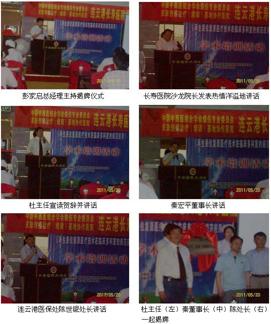 2011年5月20日上午8:00時(shí),在連云港千府大酒店會(huì)議廳舉行了連云港長(zhǎng)壽醫(yī)院為皮膚原位再生復(fù)原醫(yī)療技術(shù)的培訓(xùn)醫(yī)院揭牌儀式暨皮膚原位再生復(fù)原醫(yī)療技術(shù)培訓(xùn)學(xué)術(shù)講座,中國(guó)中西醫(yī)結(jié)合學(xué)會(huì)燒傷專業(yè)委員會(huì)常委、北京美寶燒傷創(chuàng)瘍研究所臨床部杜福勤主任和學(xué)會(huì)駐江蘇省辦事處劉恒主任,連云港蘇云集團(tuán)秦宏平董事長(zhǎng)、彭家啟總經(jīng)理、連云港醫(yī)保處陳世銀處長(zhǎng)、沙龍?jiān)洪L(zhǎng)、瞿艷美業(yè)務(wù)院長(zhǎng)及邀請(qǐng)的有關(guān)醫(yī)院的專家和醫(yī)護(hù)人員共60余人參加了揭牌儀式。