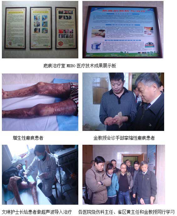 借此年會(huì),金黨軍教授和湖北辦事處黃彥勇主任到MEBO燒傷基地醫(yī)院宜昌市中醫(yī)醫(yī)院燒傷整形科做了回訪工作,并邀約宜都市第一人民醫(yī)院燒傷科徐偉主任、秭歸縣人民醫(yī)院燒傷科史永松主任、興山縣人民醫(yī)院燒傷科張衛(wèi)東主任、五峰縣人民醫(yī)院燒傷科鮮于文濤主任和陳宏宇護(hù)士長同行參觀和學(xué)習(xí)。在疤痕治療室,百忙之中,文琳護(hù)士長熱情接待了我們,也請(qǐng)金教授為做治療的患者進(jìn)行了會(huì)診,并操作了美寶疤痕軟膏結(jié)合超聲波導(dǎo)入的治療,同時(shí)肯定了此項(xiàng)技術(shù)所獲得的理想且安全的效果。