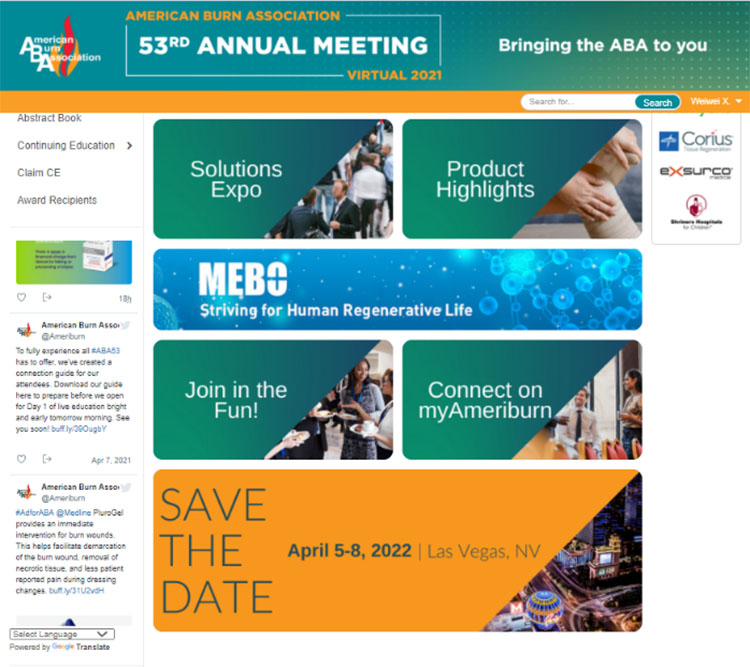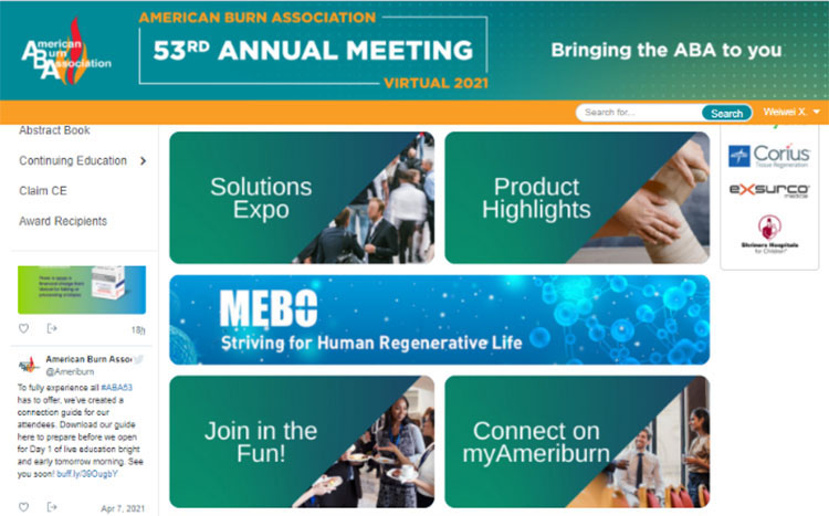 ABA線上會(huì)議不僅為燒傷領(lǐng)域的專家提供了良好的學(xué)術(shù)交流機(jī)會(huì),也為各企業(yè)展示其產(chǎn)品與技術(shù)提供了廣闊的平臺(tái),來(lái)自全球的40多家知名醫(yī)藥企業(yè)參加了此次會(huì)議。自2016年以來(lái),美寶國(guó)際已經(jīng)連續(xù)4年參加了ABA年會(huì):第49屆波士頓年會(huì)、第50屆芝加哥年會(huì),第51屆拉斯維加斯年會(huì),以及2020年線上會(huì)議。今年,美寶國(guó)際再度受邀參加2021年ABA線上會(huì)議,與全球?qū)<液推髽I(yè)一道,探索與推動(dòng)燒傷治療的未來(lái)發(fā)展,并將繼續(xù)以再生生命科學(xué)領(lǐng)航者的身份,促進(jìn)全球再生生命科學(xué)的持續(xù)發(fā)展與科技創(chuàng)新。