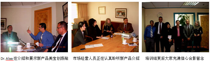 一、欲其事必先利其器。2011年3月12日,為了做好美寶創(chuàng)瘍貼的經(jīng)營和啟動(dòng)工作,海灣JULPHAR藥廠和阿聯(lián)酋負(fù)責(zé)美寶產(chǎn)品經(jīng)營的人員主動(dòng)放棄周六休息的時(shí)間進(jìn)行產(chǎn)品知識(shí)培訓(xùn)。中國燒傷創(chuàng)瘍科技中心臨床部的陳永翀教授給大家講解了美寶創(chuàng)瘍貼的再生醫(yī)學(xué)機(jī)理、臨床使用方法和臨床效果,Dr. Alaa Helail則向大家做了美寶創(chuàng)瘍貼新產(chǎn)品的介紹,期間大家還認(rèn)真討論和確定了接下來的幾天在迪拜市和阿布扎比市的醫(yī)療開發(fā)與產(chǎn)品發(fā)布會(huì)的具體安排。通過這次培訓(xùn),使經(jīng)營人員了解和掌握了美寶創(chuàng)瘍貼的再生愈合機(jī)理、效果,以及與其它同類競(jìng)爭產(chǎn)品的區(qū)別與優(yōu)勢(shì),大家對(duì)該產(chǎn)品的經(jīng)營充滿了信心。