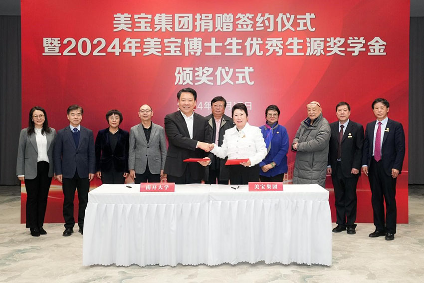 12 月 17 日,美寶集團捐贈簽約儀式暨 2024 年美寶博士生優(yōu)秀生源獎學(xué)金頒獎儀式在南開大學(xué)海冰樓舉行。當(dāng)天,南開大學(xué)津南校區(qū)“榮祥樓”正式揭牌。