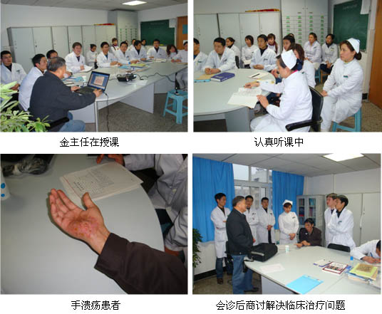 學術會議由戴主任主持,金教授先向大家介紹了燒傷及燒傷皮膚原位再生醫(yī)療技術的概念,而該技術是由濕潤暴露療法和濕潤燒傷膏來共同完成;介紹了暴露療法創(chuàng)面處理的原則、處理方式、規(guī)范換藥技術以及各類深淺度燒傷、潰瘍、褥瘡、糖尿病足、斷指再生等創(chuàng)面的處理方法;并通過展示大量真實的臨床病例圖片,使大家真正了解皮膚原位再生醫(yī)療技術及其再生產品的先進性、實用性;隨后金教授介紹了再生醫(yī)療技術新產品—創(chuàng)瘍貼對壓瘡、糖尿病足潰瘍等創(chuàng)面的治療,并介紹了其作用原理、產品組成結構、各類創(chuàng)面使用的方法等;還著重講解了在5.12四川災區(qū)應用再生醫(yī)療技術治療眾多患者所取得的良好療效。在金教授課結束后,參會人員結合實際工作中所遇的問題紛紛提問,如取皮后,使用濕潤燒傷膏或速愈貼遇滲血情況如何處理,燒傷膏油紗條如何制作,III度燒傷創(chuàng)面是否采用包扎療法等,現(xiàn)場氣氛十分活躍,金教授一一為大家做了細致回答,并在會議結束后對一位手部創(chuàng)傷患者進行了會診。
