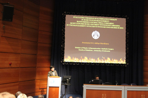 在下午的自由發(fā)言中來自印度尼西亞大學的Anastasia Dessy 醫(yī)生以再生醫(yī)療技術與蜂蜜敷料在二度燒傷創(chuàng)面的對比進行了演講。她通過兩種方法在創(chuàng)面愈合時間,愈合質量,以及愈合后疤痕情況等等幾個方面進行了全面對比研究。并得出結論兩組對比發(fā)現(xiàn)再生醫(yī)療技術組愈合時間明顯縮短同時患者痛苦小但創(chuàng)面愈合質量高,同時指出,在他們醫(yī)院之前的研究中已有蜂蜜輔料對傳統(tǒng)SSD的對比試驗,結果顯示蜂蜜輔料組明顯優(yōu)于SSD組,因而其結論是:MEBO是在創(chuàng)面治療中的最佳選擇。在場與會專家非常認可并接受這種非常嚴謹?shù)目茖W對比試驗,對美寶的結果表示信服,同時通過上午的發(fā)言對再生醫(yī)療技術已經(jīng)有了一定的了解,因此提出更為深入的問題,如到底“美寶”是什么?(美寶的成分)以及其藥理,愈后疤痕治療評價等等問題。Anastasia醫(yī)生以她的理解一一給予解答。