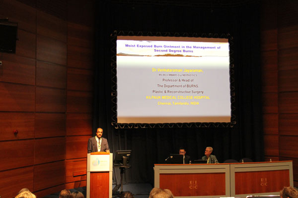 接下來,來自印度南部最大燒傷中心的主任Jayraman 醫(yī)生做了題為再生醫(yī)療技術在燒傷創(chuàng)面治療的經(jīng)驗的演講。演講過程中Jayaraman主任總結了此項技術的極大優(yōu)勢例如保持創(chuàng)面濕潤環(huán)境,抗炎抗感染以及痛苦小等等優(yōu)點。同時也展示再生醫(yī)療技術在印度臨床試驗過程收集的多個病例,通過生動鮮活的病例折服了在場所有觀眾。特別需要指出的是,Jayraman 主任對美寶的再生機理給予了詳細的解釋,從潛能再生細胞到干細胞,從再生環(huán)境到再生技術,給與會專家又一全面的美寶科學的展示。在回答問題的環(huán)節(jié),Jayraman 主任與與會代表探討了燒傷愈后色素沉著的測量方法,美寶作用下干細胞再生的發(fā)生部位和過程等等,無論是提問還是回答,都相當精彩!