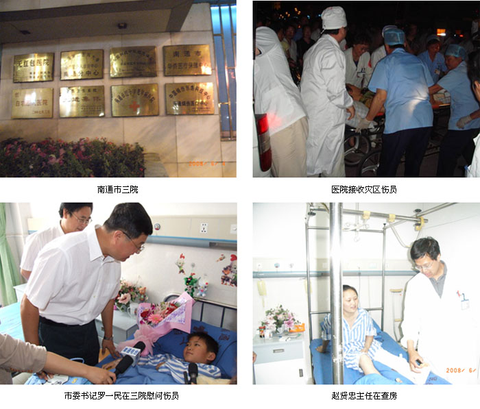 南通市第三人民醫(yī)院是一座集醫(yī)療、教學(xué)、科研為一體的三級(jí)甲等醫(yī)院,也是中國(guó)燒傷創(chuàng)瘍科技中心南通燒傷醫(yī)療中心,是全國(guó)燒傷創(chuàng)瘍醫(yī)療網(wǎng)的核心基地醫(yī)院。這次汶川地震傷員轉(zhuǎn)移治療中于2008年5月31日晚該院接收了10名四川傷員。災(zāi)區(qū)傷員到達(dá)當(dāng)晚,中國(guó)燒傷創(chuàng)瘍科技中心南通燒傷中心主任、中國(guó)抗震救災(zāi)創(chuàng)瘍專家醫(yī)療隊(duì)江蘇組長(zhǎng)趙賢忠主任受命對(duì)從災(zāi)區(qū)轉(zhuǎn)來(lái)南通三院的所有傷員進(jìn)行查房,并根據(jù)需要對(duì)所有相關(guān)傷員進(jìn)行會(huì)診治療,保證災(zāi)區(qū)傷員能得到先進(jìn)的再生療法治療,最大限度地減輕傷情,減少繼發(fā)殘廢。6月1日南通市委書記羅一民來(lái)到市三院 “愛(ài)心病房” 慰問(wèn)汶川災(zāi)區(qū)傷員者,他走到綿竹傷員病床前,關(guān)切地詢問(wèn)他的病情和護(hù)理情況,“你放心在這里養(yǎng)傷,南通人民就是你的親人?!崩钪蚊餮劾镩W著淚花: “醫(yī)護(hù)人員、志愿者都那么好,這里就像我的家!”