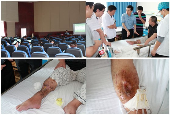 隨后,王洪生主任應(yīng)邀來到外科病房,為一例右小腿斷肢再植后并骨外露患者和一例難愈合創(chuàng)面的病人會診,指導(dǎo)對兩位患者的創(chuàng)面的治療,在病房中現(xiàn)場教授醫(yī)生們?nèi)绾芜\用再生醫(yī)療技術(shù)來規(guī)范化處理治療難愈性創(chuàng)面。