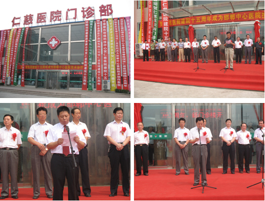 2010年8月8日,中國燒傷創(chuàng)瘍科技中心武安分中心、河北武安仁慈醫(yī)院舉行建院十五周年暨門診大樓落成、邯鄲市中心醫(yī)院技術協作醫(yī)院成立慶?;顒?。三喜臨門,武安市仁慈醫(yī)院張燈結彩,從醫(yī)院領導到全體員工精神煥發(fā)、喜氣洋洋,武安市領導和人大、政協以及衛(wèi)生界各級領導出席盛會,武安市各級醫(yī)院代表到會祝賀。