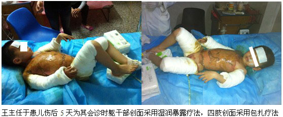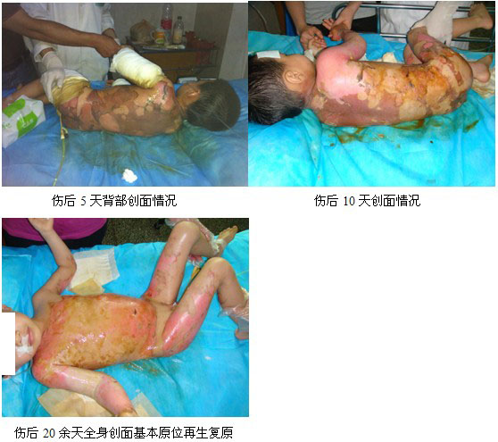 病例一.患兒XX,男,4歲,以“沸水燙傷全身多處伴疼痛半小時(shí)”為主訴于2011年4月11日急診入院。入院時(shí)查體:T:37.4℃,P:88次/分,R:20次/分,神志清楚,急性痛苦病容,四肢、前后軀干、臀部及會陰部散在大小不等的水皰,部分創(chuàng)面腐皮脫失,基底紅白相間,少滲出,感覺鈍。入院診斷:沸水全身燙傷40%TBSA,深I(lǐng)I度,特重度;患者入院后對其創(chuàng)面處理全程采用燒傷皮膚原位再生復(fù)原技術(shù),結(jié)合全身綜合治療,經(jīng)過對其近1個月的精心救護(hù),患兒順利渡過休克關(guān)、感染關(guān),創(chuàng)面愈合而出院。