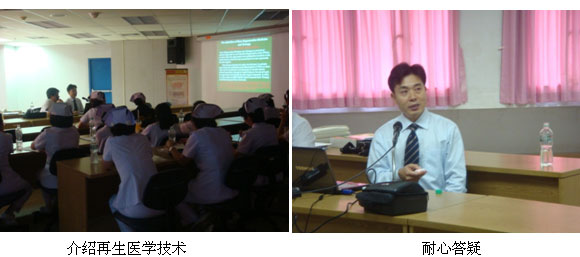 3月1日,我們應邀前往位于曼谷市大型私立醫(yī)院Ramkumhang Hospital進行全新的醫(yī)療開發(fā)工作。聽課醫(yī)生分別來自外科,內(nèi)科及整形外科,王洪生主任以再生醫(yī)療技術(shù)的臨床應用為主題,生動地向聽課人員展示了再生醫(yī)學在燒傷、創(chuàng)瘍等多領域的臨床應用,圖文并茂,醫(yī)生們認真聽講,對MEBT/MEBO興趣較大。會后兩名重點醫(yī)生跟王主任就微粒皮種植術(shù)進行進一步交流,王主任針對問題都給與了耐心而專業(yè)的解答。