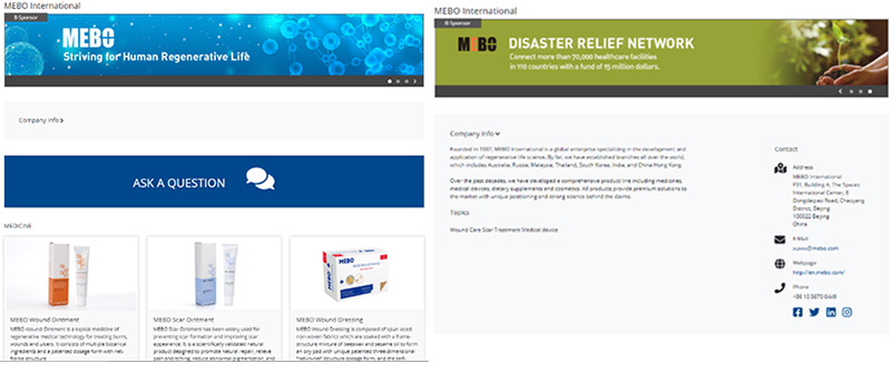 美寶國際精心設(shè)計的在線展臺,力求從多方面向與會者展示企業(yè)風(fēng)采。在產(chǎn)品方面,不僅展示了濕潤燒傷膏、疤痕軟膏等已在全球應(yīng)用數(shù)十年的核心產(chǎn)品,還重點介紹了近期在美國成功注冊的創(chuàng)瘍帖。同時,在展臺醒目的位置上,特別呈現(xiàn)了近日我們在聯(lián)合國75周年峰會上提出的全球倡議——與全球110個國家7萬多家醫(yī)療機構(gòu)合作,建立全球災(zāi)難與救援網(wǎng)絡(luò)。