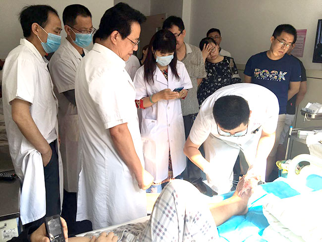 交流期間,丁明華教授向來賓全方位地介紹了再生醫(yī)療技術(shù)在難愈性創(chuàng)面治療中的獨(dú)特功效,重點(diǎn)以實(shí)例形式強(qiáng)調(diào)了再生技術(shù)在臨床應(yīng)用中對(duì)病人的極大助益。丁教授帶領(lǐng)來訪專家一行到病房看望了接受再生療法治療的病人,并介紹了病人的治療進(jìn)展情況,良好的治愈效果受到了專家主任對(duì)美寶的一致認(rèn)可和高度評(píng)價(jià)。