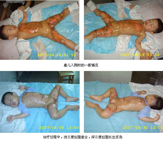 2007年6月18日下午3時,廣州花都中醫(yī)院燒傷外科急診收入一例小兒大面積燒傷患兒。該患兒男性,1歲11個月。以“熱液燙傷全身多處并疼痛滲液1小時”為主訴急診入院。入院時體查示:左側面頸部、胸前壁、腹壁、會陰部、雙側大腿創(chuàng)面可見散在大小不等的水皰,部分腐皮破潰,創(chuàng)基紅白相間或蒼白色,滲液較多,觸痛明顯。入院診斷:熱液全身多處燙傷Ⅱ-Ⅲ度總面積28%TBSA(淺Ⅱ度8%、深Ⅱ度15%、淺Ⅲ度5%);患兒入院后該院立即請求中國中西醫(yī)結合學會燒傷專委會常委、北京燒傷創(chuàng)瘍研究所副所長、臨床研究部主任王洪生為患兒會診。王主任到達該院并查看患兒后、立即與燒傷外科主任雷震及主管醫(yī)生萬志強共同為患兒制定了適宜的救治方案,即對患兒創(chuàng)面處理采用外涂美寶濕潤燒傷膏行濕潤暴露療法,全身治療采用抗休克、抗感染、營養(yǎng)支持及臟器功能維護等綜合措施。經二十余天積極有效的治療,患兒平穩(wěn)渡過了休克關、感染關,左側面頸部、胸腹部、右側大腿淺Ⅱ度、深Ⅱ度及左側大腿、會陰部、陰莖處淺Ⅲ度創(chuàng)面已基本生理性愈合。