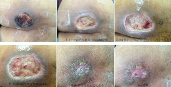 2014年深秋一名來(lái)自太原北部郊區(qū)的農(nóng)民患者,身患嚴(yán)重的腰椎間盤(pán)突出癥狀,給生活勞動(dòng)帶來(lái)諸多不便。經(jīng)醫(yī)院診斷,確診后腰椎管狹窄,腰椎第4、5間盤(pán)突出,經(jīng)醫(yī)患溝通后同意行①椎間盤(pán)射頻熱凝術(shù)。②椎間盤(pán)開(kāi)放手術(shù)加鋼板手術(shù)。術(shù)后發(fā)生左下肢去神經(jīng)皮膚癥狀(無(wú)疼痛感覺(jué))科室采用綜合醫(yī)診,包括針灸按摩等,12月下旬,行艾灸針灸時(shí),因艾卷脫落,將臀部皮膚深度燒傷(深Ⅲ°)。2015年元月3日,北京燒傷創(chuàng)瘍研究所副所長(zhǎng)趙瑞慶教授應(yīng)邀前往該院進(jìn)行會(huì)診,在該院頸椎疼痛科醫(yī)務(wù)人員的積極配合下,及時(shí)清除焦痂樣深部壞死組織,局部用藥改用徐榮祥教授創(chuàng)立的燒傷創(chuàng)瘍?cè)偕t(yī)學(xué)與療法,10天后創(chuàng)面發(fā)生了可喜的變化。壞死組織清理液化完畢,新生的肉芽開(kāi)始生長(zhǎng)。25天后肉芽生長(zhǎng)達(dá)到高峰值狀態(tài),將創(chuàng)口完全填充豐滿(mǎn)。36天創(chuàng)面完全封閉。春節(jié)后趙教授隨訪(fǎng)病人時(shí),患者非常激動(dòng)地說(shuō)到:感謝趙教授多次來(lái)院給我看病,我的傷口采用新方法治療,中間沒(méi)有發(fā)生感染,一個(gè)多月就好嘞,我太高興了!