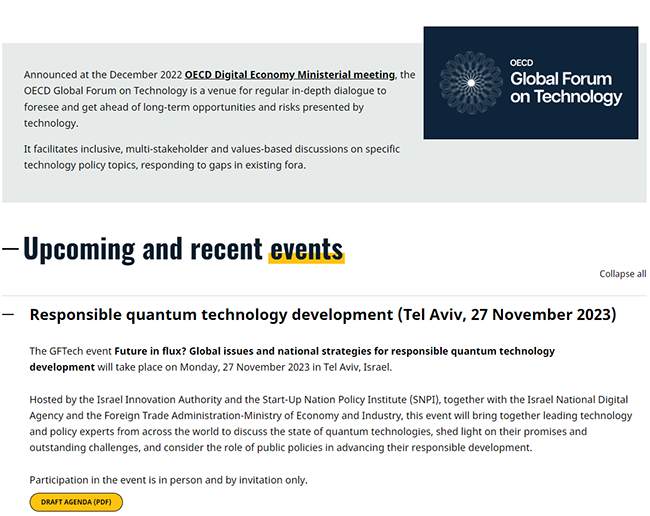 本次經合組織全球技術論壇由以色列創(chuàng)新局和創(chuàng)業(yè)國家政策研究所(SNPI)、以色列國家數(shù)字機構和以色列對外貿易管理局-經濟和工業(yè)部共同主辦,將匯集領先的技術和政策專家,討論量子技術的現(xiàn)狀,突出其前景和問題,并考慮公共政策在促進其發(fā)展方面的重要作用。以色列、美國、丹麥、英國、奧地利、印度、日本、加拿大、巴塞羅那等國家和地區(qū)的科技部負責人、具有開創(chuàng)性的技術專家、國家政策研究中心或國家科學研究中心責任人、重要技術企業(yè)的CEO等將出席此次大會。