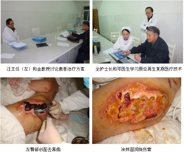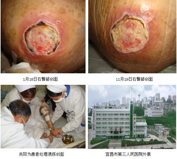 2010年12月17日至12月19日,中國(guó)中西醫(yī)結(jié)合學(xué)會(huì)燒傷專(zhuān)業(yè)委員會(huì)金黨軍教授在對(duì)宜昌市各醫(yī)院走訪期間,應(yīng)該院外科汪長(zhǎng)青主任和全麗麗護(hù)士長(zhǎng)的邀請(qǐng),對(duì)剛?cè)朐旱囊晃荒X梗塞偏癱老年患者多發(fā)性褥瘡創(chuàng)面進(jìn)行了臨床換藥指導(dǎo)。該患已79歲高齡,金教授見(jiàn)到患者時(shí),背部褥瘡結(jié)黑痂,左臀部形成空腔,這兩處面積較大,伴有惡臭;另右臀部、膝蓋、左小腿及左腳均有潰瘍創(chuàng)面,并伴低蛋白血糖和疝氣。在全護(hù)士長(zhǎng)等護(hù)士的陪同下,金教授為患者耐心地清洗周邊的創(chuàng)面,剪去黑痂,空腔上使用濕潤(rùn)燒傷膏油紗條填塞,并采用藥膏和創(chuàng)瘍貼結(jié)合換藥,金教授通過(guò)兩個(gè)多小時(shí)實(shí)際操作,詮釋了再生醫(yī)療技術(shù)對(duì)創(chuàng)面的處理要點(diǎn),隨后金教授結(jié)合多媒體材料為現(xiàn)場(chǎng)的醫(yī)護(hù)人員講解了再生醫(yī)療技術(shù)在燒傷、創(chuàng)瘍、褥瘡、潰瘍等創(chuàng)面的應(yīng)用,講課結(jié)束后,現(xiàn)場(chǎng)的醫(yī)護(hù)人員表示通過(guò)看到金教授親自為患者換藥及他精彩地講課,使大家實(shí)實(shí)在在地掌握了原位再生復(fù)原醫(yī)療技術(shù)的規(guī)范換藥及其在臨床各科室的廣泛應(yīng)用,今后會(huì)不斷提高原位再生復(fù)原醫(yī)療技術(shù)水平,救治更多患者。