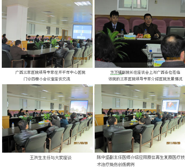 為打造優(yōu)勢???,在中國中西醫(yī)結(jié)合學會燒傷專業(yè)委員會常委、中國燒傷創(chuàng)瘍雜志副總編輯、北京燒傷創(chuàng)瘍研究所副所長、臨床研究部王洪生主任的精心安排下,廣西來賓市中醫(yī)醫(yī)院、貴港市中醫(yī)醫(yī)院、桂平市中醫(yī)醫(yī)院三家醫(yī)院的院長親自掛帥,帶領(lǐng)院級領(lǐng)導(dǎo)及相關(guān)科室主任、護理部主任、護士長和相關(guān)專業(yè)專家一行36人于2011年3月20日上午9時,齊聚廣東省開平市中心醫(yī)院,拉開了兩廣多家醫(yī)院跨省區(qū)考察和臨床學術(shù)交流的序幕。