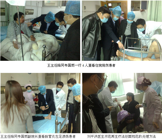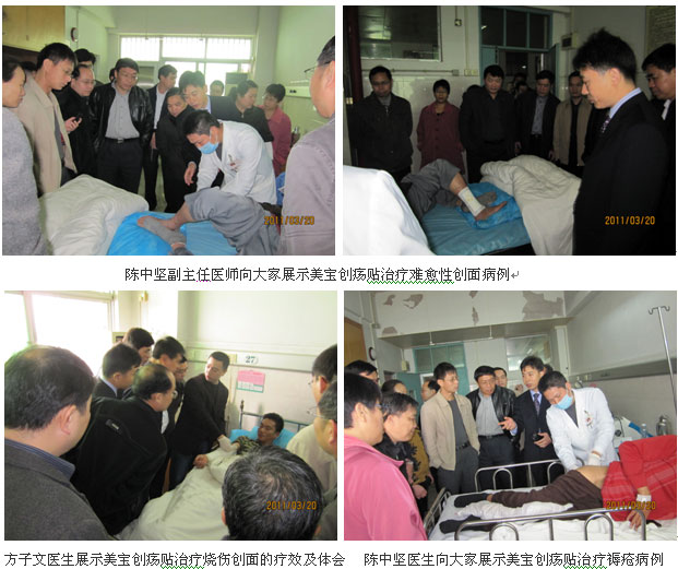 2011年3月21日上午9時30分,桂平市中醫(yī)院的韋國雨副院長、大骨科主任黎小琳副主任醫(yī)師、大外科主任黎海副主任醫(yī)師等4人在王洪生主任陪同下來到廣州市中西醫(yī)結(jié)合醫(yī)院參觀交流,廣州市中西醫(yī)結(jié)合醫(yī)院主管副院長劉樹華副主任醫(yī)師、大外科主任張向東副主任醫(yī)師親自到醫(yī)院大門迎接。韋國雨一行首先在劉樹華副院長及張向東主任的陪同下來到該醫(yī)院住院大樓6樓燒傷創(chuàng)瘍科參觀,主治醫(yī)師劉平洪帶領(lǐng)大家深入燒傷創(chuàng)瘍病房,查看正在該科住院的燒傷、脈管炎合并下肢潰瘍、褥瘡、糖尿病足等患者,并親自為患者換藥示范皮膚原位再生復(fù)原醫(yī)療技術(shù)規(guī)范的創(chuàng)面處理技術(shù)。查房結(jié)束后,韋國雨副院長一行又來到該院門診四樓小會議室,進行座談交流,在座談會上,首先劉樹華副院長介紹了該院的整體發(fā)展情況,隨后劉平洪主治醫(yī)師著重介紹了這幾年運用皮膚原位再生復(fù)原醫(yī)療技術(shù)治療大面積深度燒傷及糖尿病足等難愈性創(chuàng)面典型臨床病例資料。在座談會結(jié)束后,韋國雨副院長對劉樹華副院長地熱情接待表示了衷心感謝,他說,我們廣東、廣西同飲一江水,希望以后進一步加強兩院之間的交流,以增進友誼,相互學習,相互借鑒好的技術(shù),共同發(fā)展,共同提高。