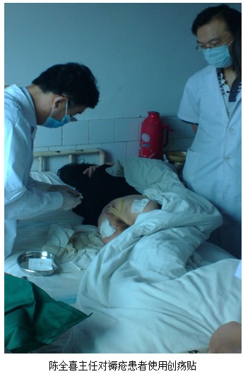 骨科劉主任會診一位脛前脛骨外露患者。患者呂雙,4個月前因車禍造成左小腿粉碎性骨折,經(jīng)三次手術(shù),大部分愈合。有一骨縫處三次手術(shù)植皮壞死,皮瓣相繼缺血壞死。陳全喜主任會診后說:“患者傷口細菌培養(yǎng)未發(fā)現(xiàn)細菌生長,就說明一個問題:傷面組織老化(纖維化),血運差。需要體外再生營養(yǎng)物質(zhì)供細胞營養(yǎng),激活傷面中的潛能細胞(體細胞),把體細胞誘導(dǎo)成干細胞,最終修復(fù)創(chuàng)面。這個理論是生命科學(xué)家徐榮祥教授在燒傷創(chuàng)瘍面上實踐得來的。美寶創(chuàng)瘍貼可改善細胞需要的生理濕潤環(huán)境,創(chuàng)瘍貼的物質(zhì)在皮膚溫度的溫化下成為液態(tài),液態(tài)不分的藥物與創(chuàng)面壞死組織發(fā)生反應(yīng),失去親脂性,并與創(chuàng)面的滲出物、液化物相混合后,向藥層外移動,一直沖破藥膜排除。上層藥物在皮溫擴散的溫化下,持續(xù)供給液層,液層藥物又不斷與創(chuàng)面壞死層發(fā)生水解、酶解、酸敗、皂化、酯化和等多種生物化學(xué)反應(yīng),循環(huán)往復(fù)自動引流,這是使創(chuàng)面壞死皮膚組織從固態(tài)轉(zhuǎn)化為液態(tài)的主要機制。創(chuàng)瘍貼的藥物不斷供給創(chuàng)面,在發(fā)揮無損傷的液化排除壞死組織功能的同時促進創(chuàng)面皮膚再生修復(fù)。