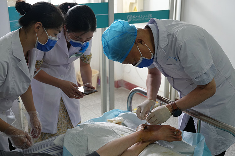 8月27日,應(yīng)株洲市三三一醫(yī)院皮膚科陳主任邀請(qǐng),《中國(guó)燒傷創(chuàng)瘍雜志》編委、燒傷創(chuàng)瘍?cè)偕t(yī)療技術(shù)臨床專家金黨軍,到科室會(huì)診兩位糖尿病足患者。金教授贊揚(yáng)了科室治療糖尿病足的技術(shù)水平,他強(qiáng)調(diào)了燒傷創(chuàng)瘍?cè)偕t(yī)療技術(shù)清創(chuàng)換藥要點(diǎn),并親自為患者清創(chuàng)換藥。大家一致表示再生醫(yī)療技術(shù)在保證良好療效的同時(shí),大大降低患者的經(jīng)濟(jì)負(fù)擔(dān),造福了株洲百姓。