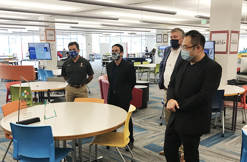 當(dāng)?shù)貢r(shí)間10月8日,美寶集團(tuán)董事局主席徐鵬攜洛杉磯周刊(LA Weekly)CEO Calle應(yīng)邀參觀考察了加州州立大學(xué)富勒頓分校電競(jìng)項(xiàng)目及電競(jìng)團(tuán)隊(duì)。加州州立大學(xué)富勒頓分校校長(zhǎng)Fram Virje(在線)、副校長(zhǎng) Greg Saks在校園現(xiàn)場(chǎng)熱情接待了徐鵬一行。校長(zhǎng)Fram Virje特別介紹了該校,表示富勒頓分校是整個(gè)加州學(xué)生數(shù)量最多的公立大學(xué),并對(duì)徐鵬對(duì)學(xué)校的支持及學(xué)生的指導(dǎo)表示了感謝。Saks副校長(zhǎng)特意帶領(lǐng)徐鵬一行參觀了富勒頓分校圖書館電競(jìng)中心,該校電競(jìng)隊(duì)伍今年斬獲了薩科拉門托國王隊(duì)主場(chǎng)體育館舉行的電競(jìng)比賽冠軍。
