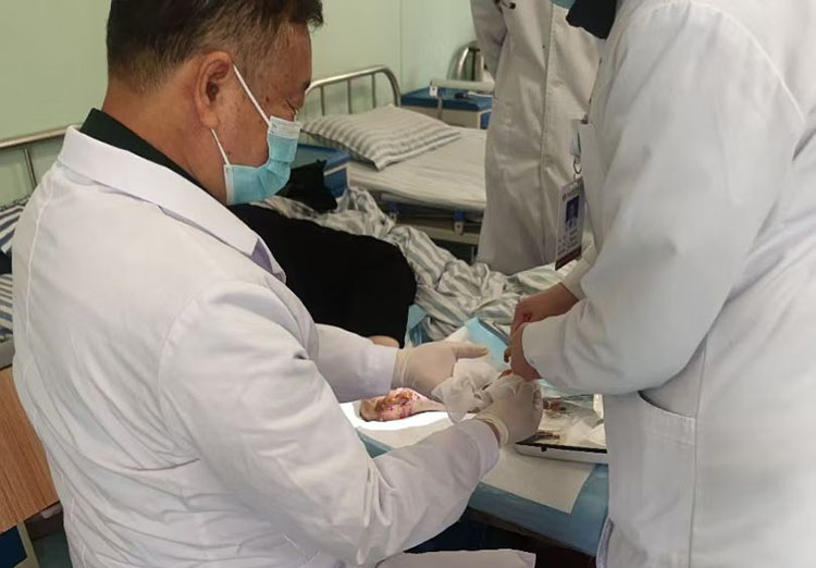 3月11日,應(yīng)湖南省懷化市芷江侗族自治縣人民醫(yī)院造口門診向海英護士邀請,《中國燒傷創(chuàng)瘍雜志》編委、燒傷創(chuàng)瘍再生醫(yī)療技術(shù)臨床專家金黨軍,到科室會診嚴(yán)重糖足患者,金黨軍主任親自示范原位再生醫(yī)療技術(shù)換藥流程,強調(diào)了換藥過程中的禁忌和注意事項,并傳授了綜合治療方案。再生醫(yī)療技術(shù)在湖南省湘西地區(qū)基層醫(yī)療單位逐漸擴大普及和應(yīng)用,為廣大燒傷創(chuàng)瘍患者帶來了福音。