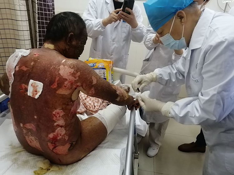 2022年11月22日,中國中西醫(yī)結(jié)合學(xué)會燒傷專業(yè)委員會醫(yī)療部張強主任應(yīng)邀前往滁州市中西醫(yī)結(jié)合醫(yī)院和安徽涵博健康集團醫(yī)院,對一例背部巨大潰瘍患者和一例燒傷患者進行會診,現(xiàn)場講解指導(dǎo)應(yīng)用再生醫(yī)療技術(shù)處理創(chuàng)面及換藥方法,并就2例患者后期的治療與主管醫(yī)生進行了交流。