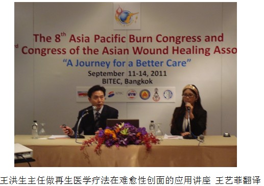 王洪生主任的最后一場(chǎng)針對(duì)再生醫(yī)學(xué)在臨床應(yīng)用新進(jìn)展的演講則全面系統(tǒng)地介紹并展示了再生的概念、臨床治療要點(diǎn)及典型病例,內(nèi)容涉及深度燒傷及骨科的肌腱外露、骨外露、四度糖尿病潰瘍、褥瘡等難愈性創(chuàng)面的治療手段及顯著效果。其中各病例創(chuàng)面治療前的嚴(yán)重程度與預(yù)后的效果形成了強(qiáng)烈鮮明的對(duì)比,使在座的每一位聽(tīng)眾都嘖嘖稱贊,大呼神奇。其后的問(wèn)答環(huán)節(jié),包括本次亞泰會(huì)議的主席在內(nèi)的多名國(guó)外專家對(duì)燒傷的成本效益比及微粒體種植等方面紛紛提出了多個(gè)專業(yè)而又深入的問(wèn)題,王主任都給予細(xì)致、全面的解答,使整個(gè)會(huì)場(chǎng)氣氛達(dá)到高潮。