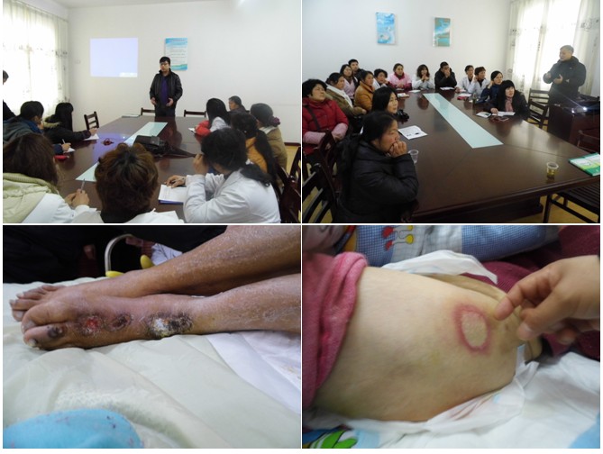 在三樓的會(huì)議室,郭院長(zhǎng)召集了全體護(hù)理人員進(jìn)行培訓(xùn),并要求大家認(rèn)真聽(tīng)講,珍惜這次難得的機(jī)遇,黃岡區(qū)域人員高偉介紹了金黨軍主任的學(xué)術(shù)背景以及再生醫(yī)療技術(shù)在實(shí)踐中的重大意義;金主任為學(xué)員們準(zhǔn)備了通俗易懂便于實(shí)際操作的課件,有針對(duì)性的結(jié)合重點(diǎn)病例,講解了再生醫(yī)療技術(shù)在壓瘡、糖尿病足等慢性難治性皮膚潰瘍治療方面的原則和換藥方法,回答了學(xué)員們的各種提問(wèn)。最后,在郭院長(zhǎng)的陪同下,金主任到各個(gè)樓層為幾位患病老人會(huì)診,現(xiàn)場(chǎng)講解治療換藥時(shí)需要注意的事項(xiàng)和方法。