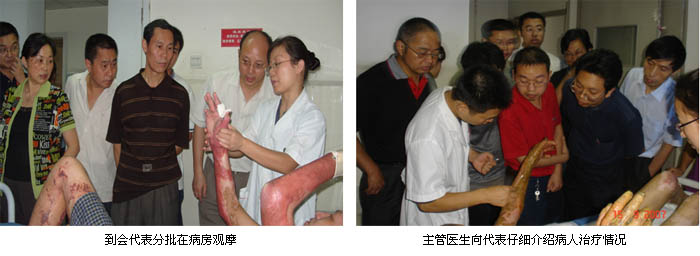 當天上午,來自各地的51家醫(yī)療單位的100余名參會代表陸續(xù)到會簽到,會務(wù)組改變以往學員直接進入會場的做法,而是按預定方案將報到學員分批帶到武警四川省消防總隊醫(yī)院燒傷整形科病房,對住院治療的28名患者逐一觀摩,并且分別由主管醫(yī)生介紹治療情況,同時回答學員提問。